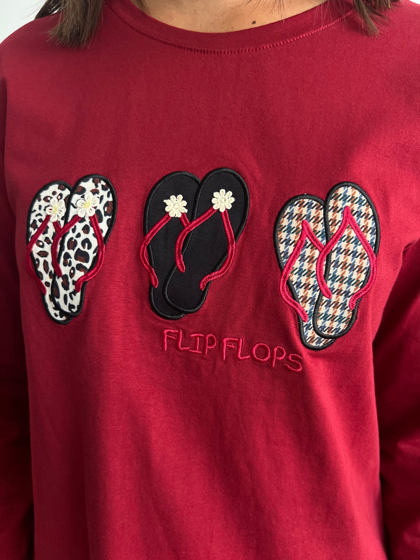 ✨ Si eres de las que no se resiste a un diseño original, esta camiseta de manga larga te va a conquistar 💙. Su estampado frontal con tres chanclas bordadas en diferentes tejidos y texturas le da un toque divertido, coqueto y lleno de personalidad 🌸🩴. La base es cómoda, suave y ligera, ideal para el día a día, pero con ese algo especial que hace que no pase desapercibida.