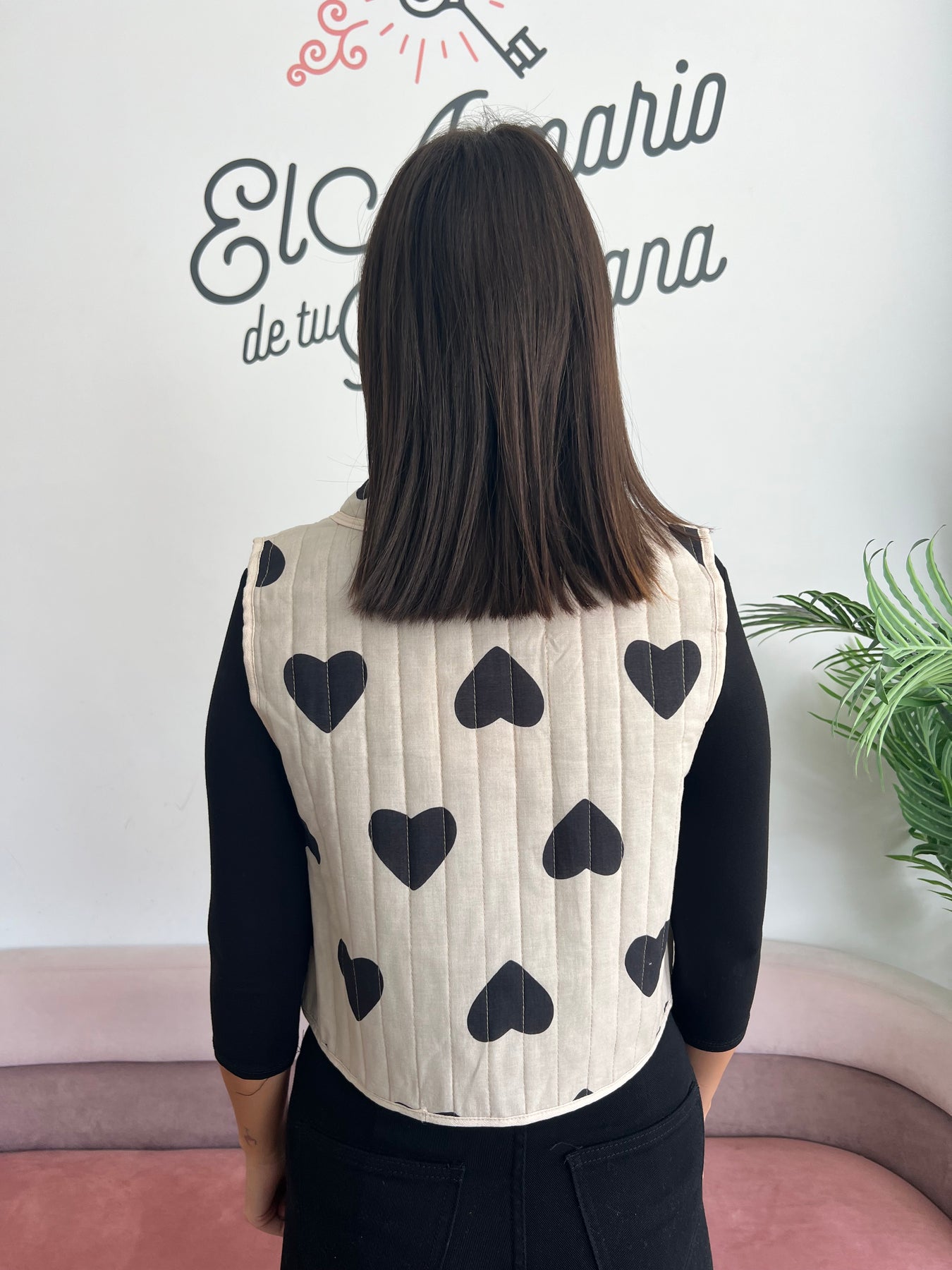 Un chaleco lleno de encanto que se convertirá en la pieza más especial de tu armario 💕. Su diseño acolchado aporta un aire actual y cómodo, mientras que el estampado de corazones lo hace súper original y femenino.