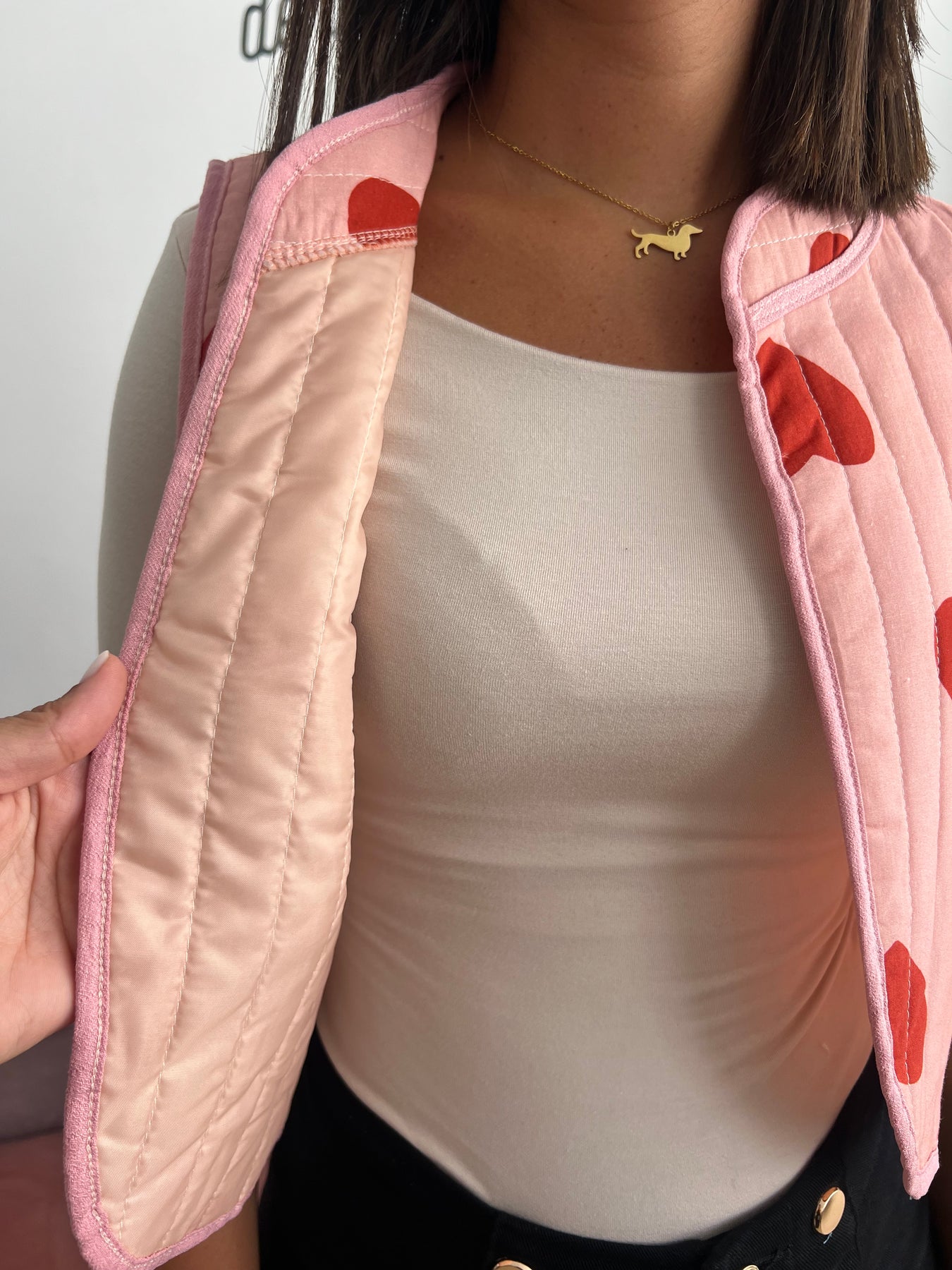Un chaleco lleno de encanto que se convertirá en la pieza más especial de tu armario 💕. Su diseño acolchado aporta un aire actual y cómodo, mientras que el estampado de corazones lo hace súper original y femenino.
