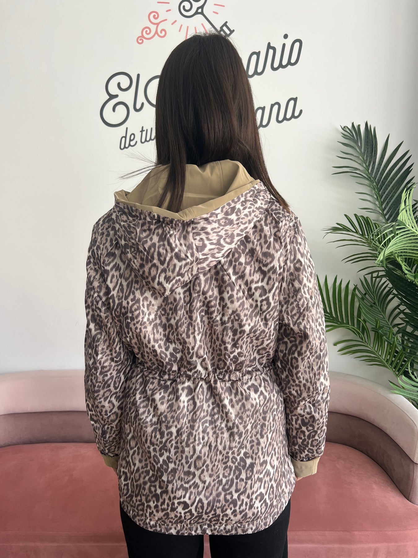 Dos chaquetas en una, ¡y ambas con estilazo! 😍 Esta chaqueta impermeable reversible es el combo perfecto entre funcionalidad y moda. Por un lado, tienes un diseño liso en tono beige súper combinable y elegante; y por el otro, un estampado animal print con personalidad, ideal para dar ese toque cañero a cualquier look.