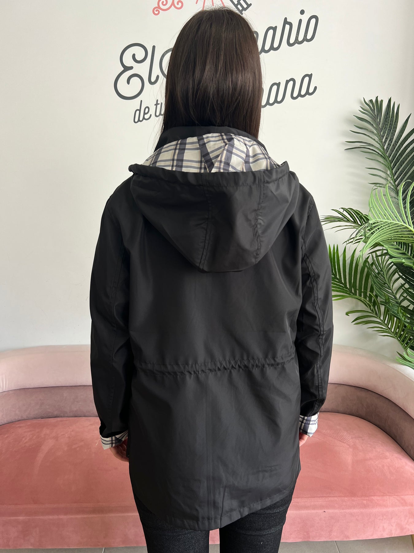 Esta chaqueta es de esas prendas que siempre salvan cualquier look porque tienes dos en uno. Por fuera luce en negro liso con detalles en cuerda y toques en marrón, y por dentro sorprende con un forro de cuadro clásico súper estiloso, que además puedes dejar ver al darle la vuelta o doblar los puños.