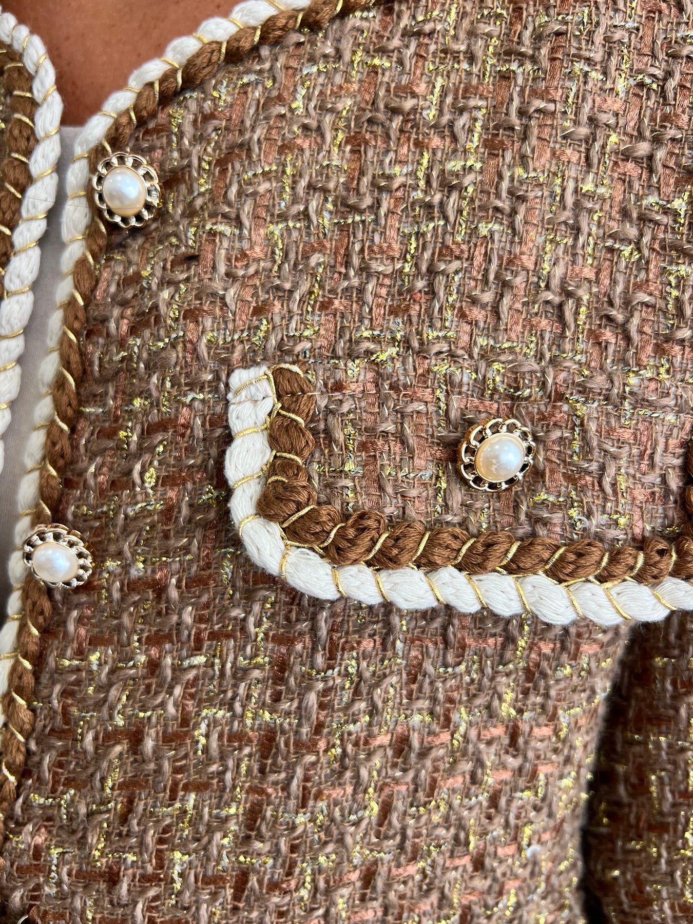 Una prenda que aporta estilo instantáneo a cualquier look. Su diseño estructurado con detalles trenzados en los bordes y botones joya la convierten en una chaqueta especial y única.