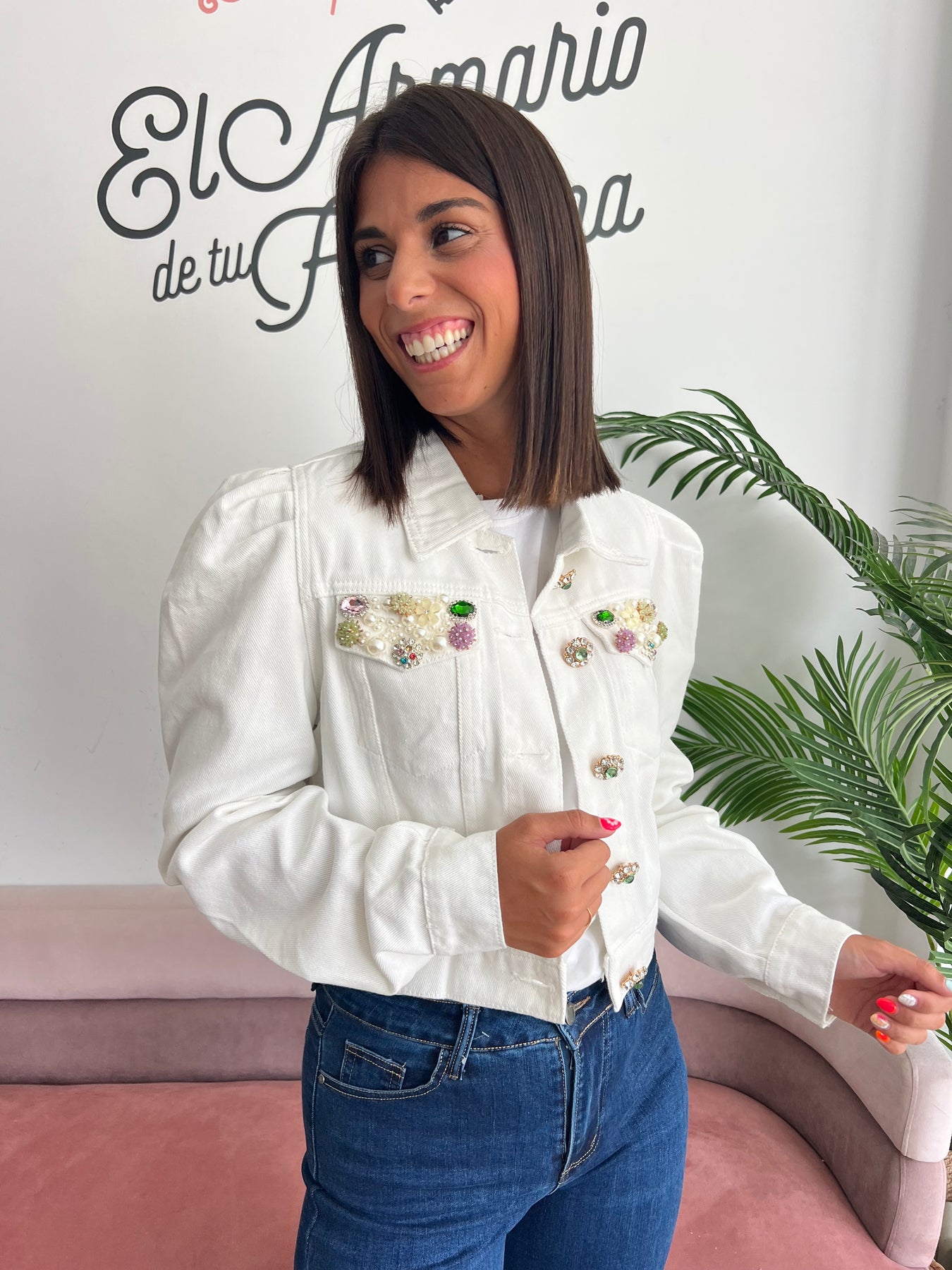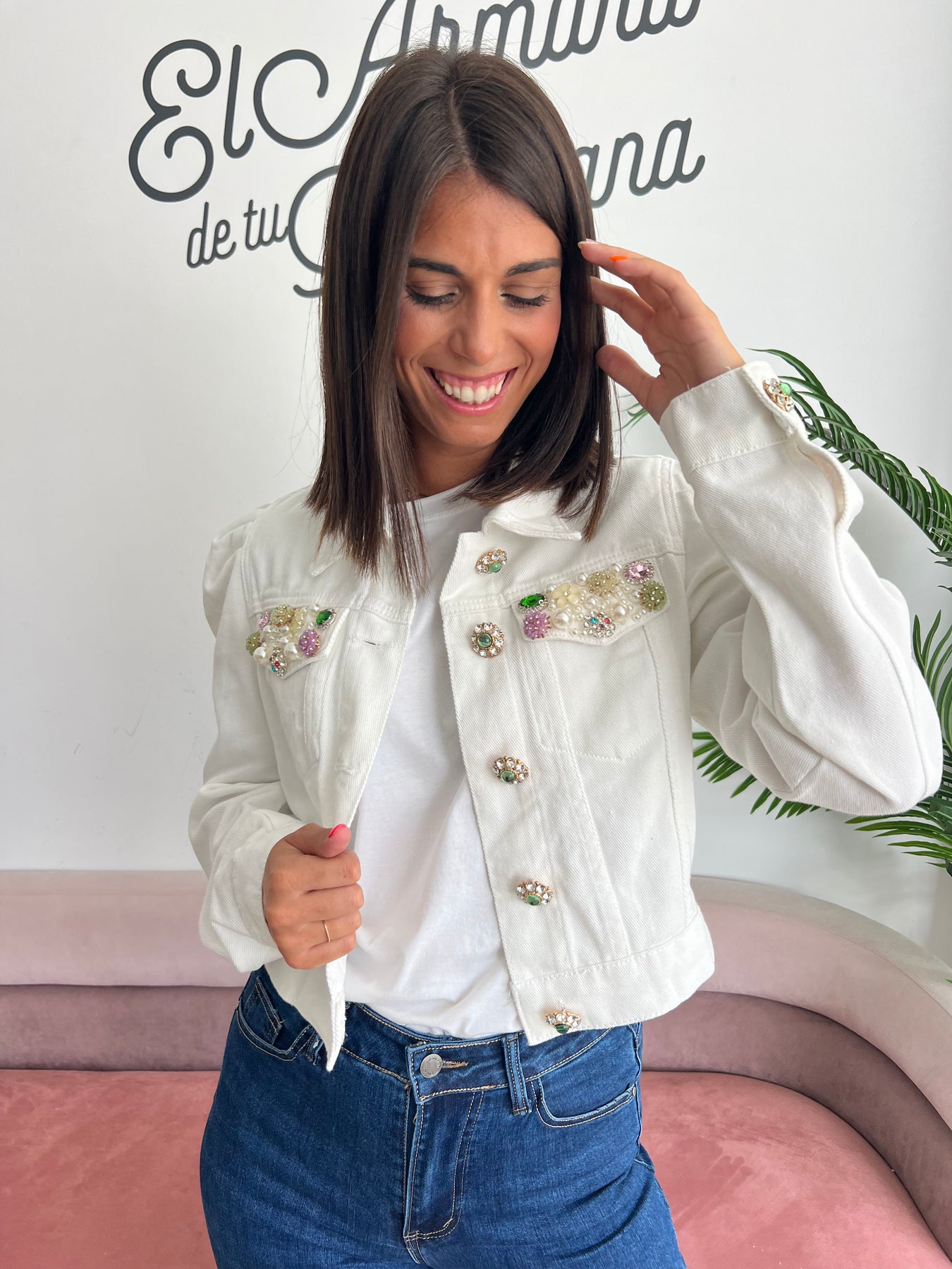 Su diseño destaca por los detalles joya en los bolsillos y botones, con aplicaciones de perlas, pedrería y cristales de colores 💎🌸 que aportan un toque glam y muy femenino. Los hombros ligeramente marcados estilizan la silueta y la hacen aún más especial.