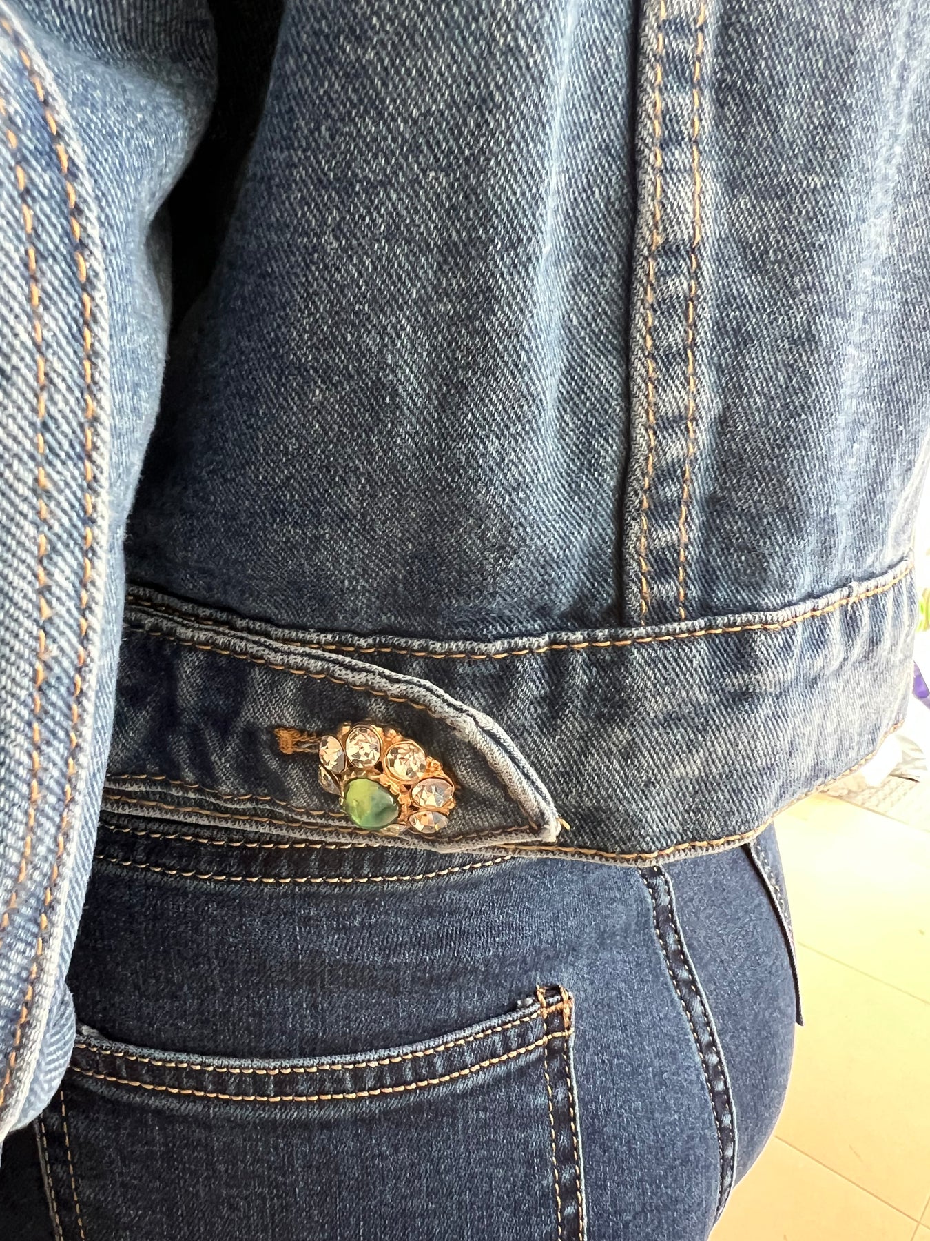 Su diseño destaca por los detalles joya en los bolsillos y botones, con aplicaciones de perlas, pedrería y cristales de colores 💎🌸 que aportan un toque glam y muy femenino. Los hombros ligeramente marcados estilizan la silueta y la hacen aún más especial.