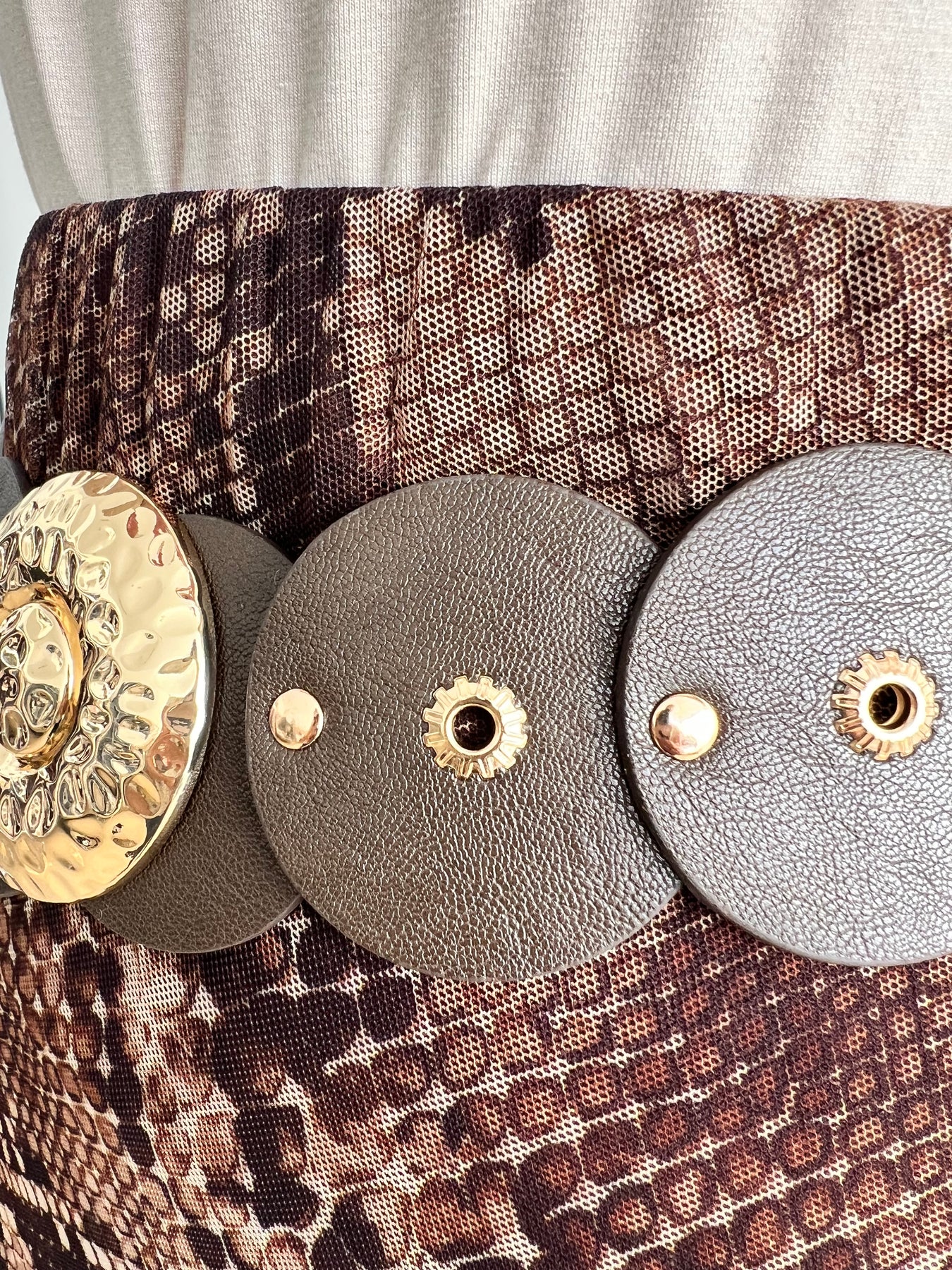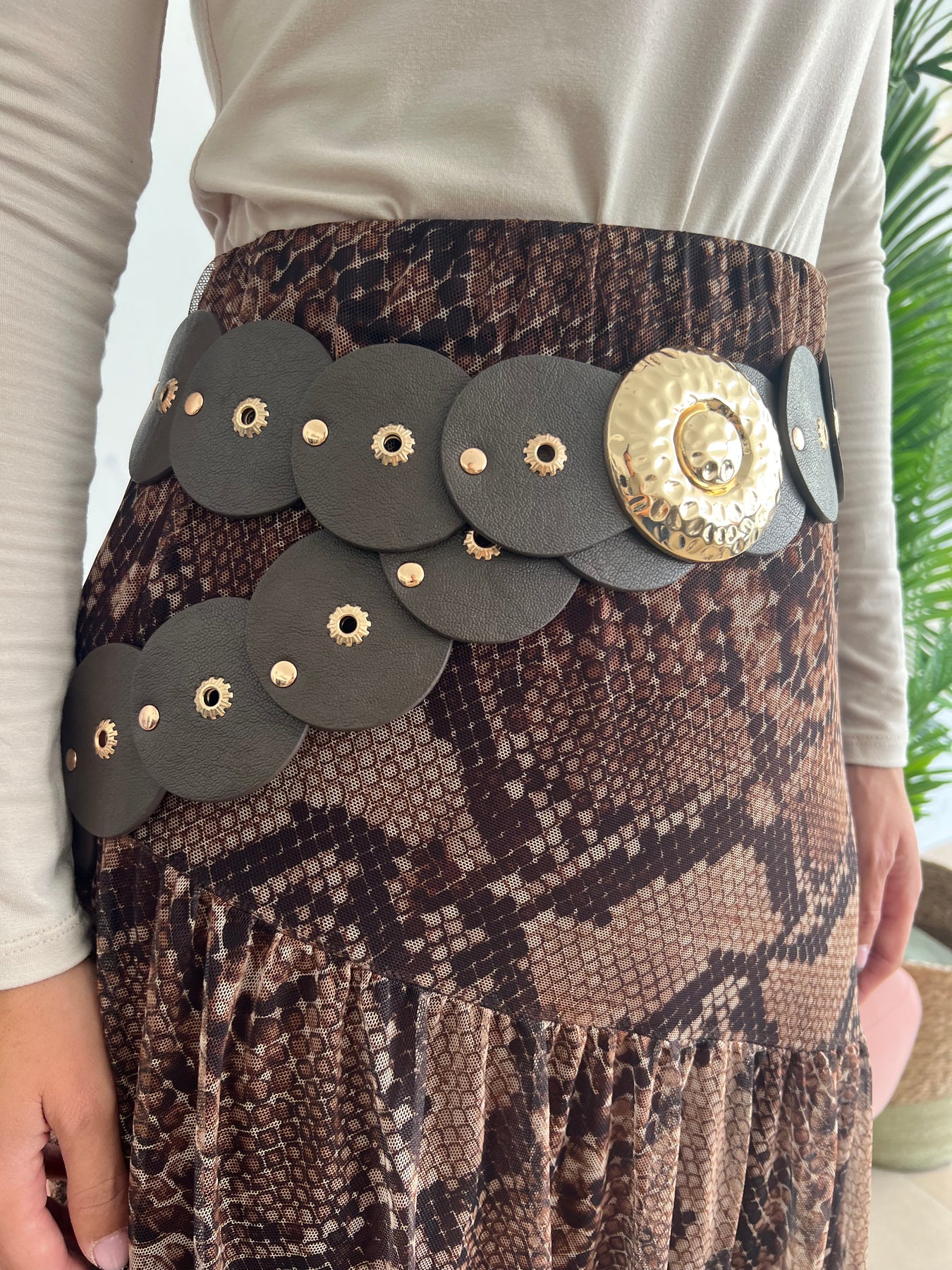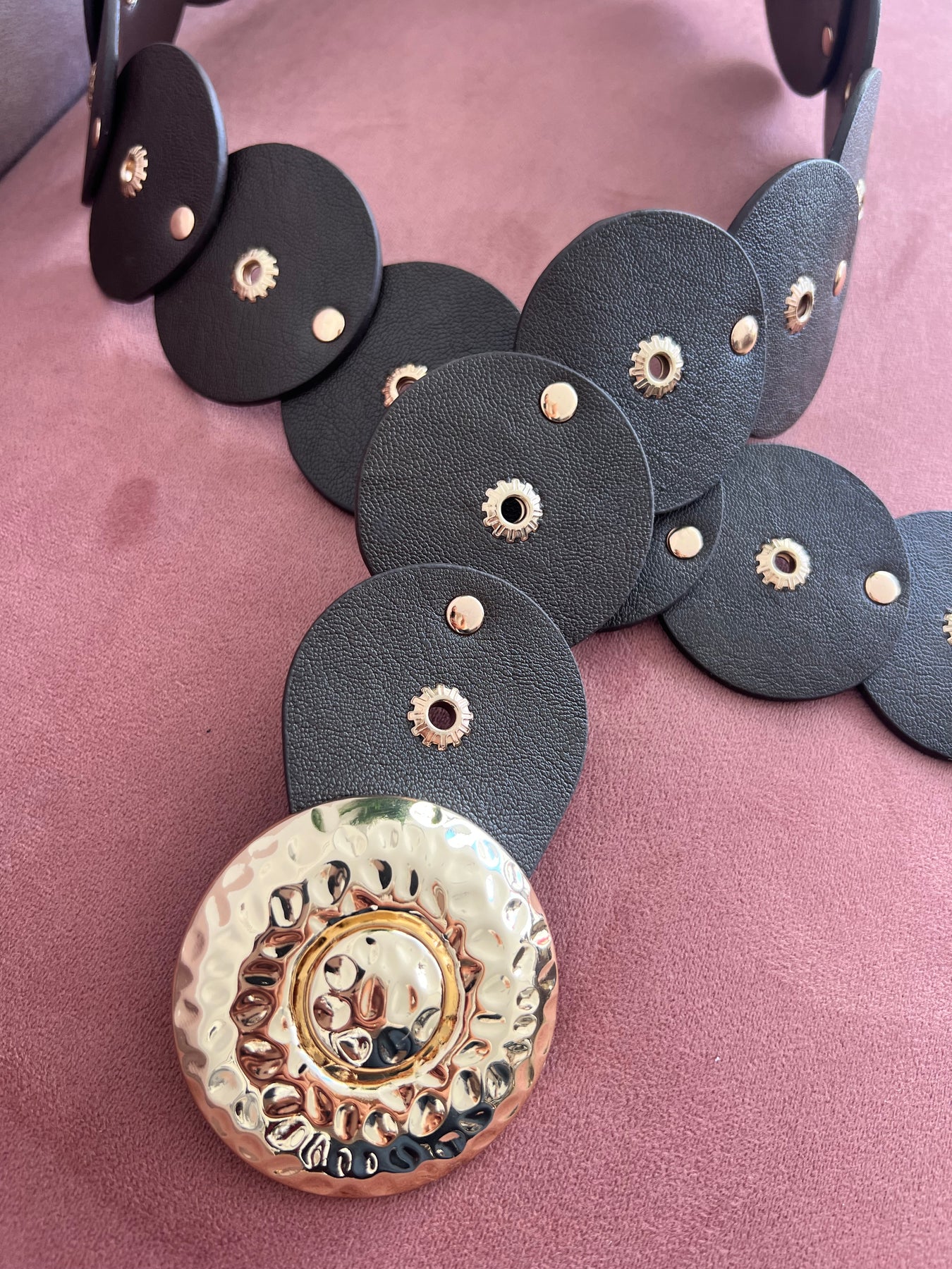 Este cinturón no es solo un accesorio, ¡es una declaración de estilo! Está formado por círculos de polipiel en color marrón chocolate, unidos con detalles metálicos y rematado con una hebilla dorada grande tipo martelé, que aporta un toque artesanal, elegante y lleno de personalidad.