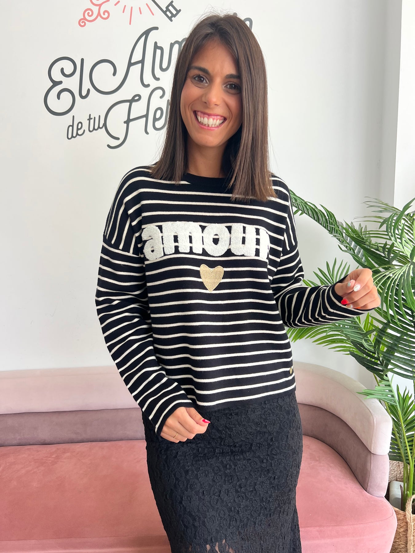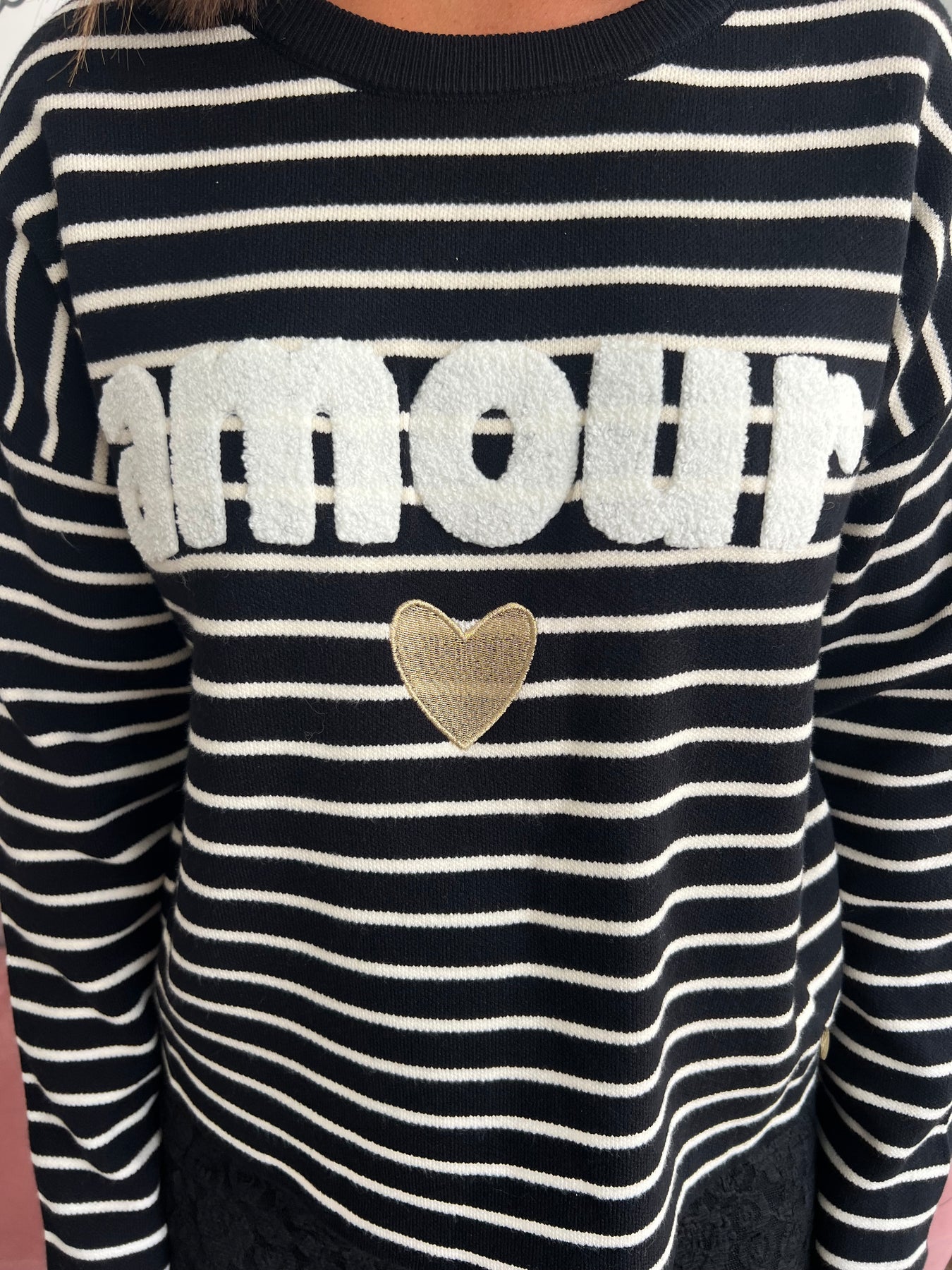 Este jersey no puede ser más ideal 😍. El clásico estampado marinero a rayas en blanco y negro se une con el detalle bordado en relieve “Amour” y un corazón dorado 💛 que lo hace único, coqueto y lleno de estilo.